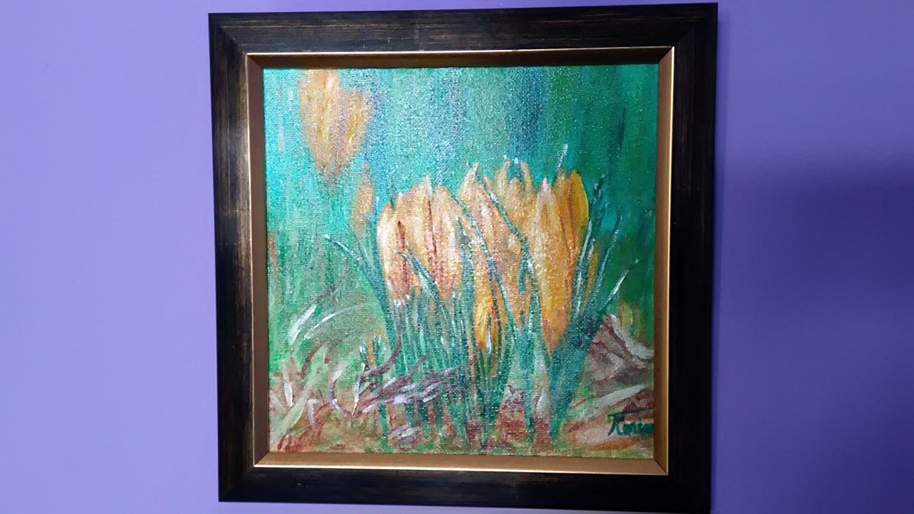 Cadouri pictate 1 si 8 MartiePictură în ulei pe carton pânzat,20x20cm, tehnică în straturi, vernisată și înrămată. Firavele brândușe, care ne încântă cu coloritul lor viu în contrast cu negrul pământului!