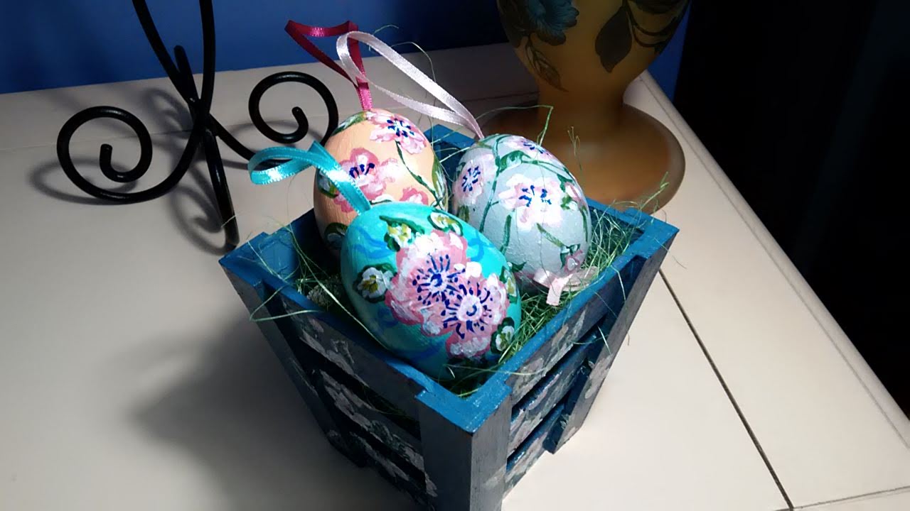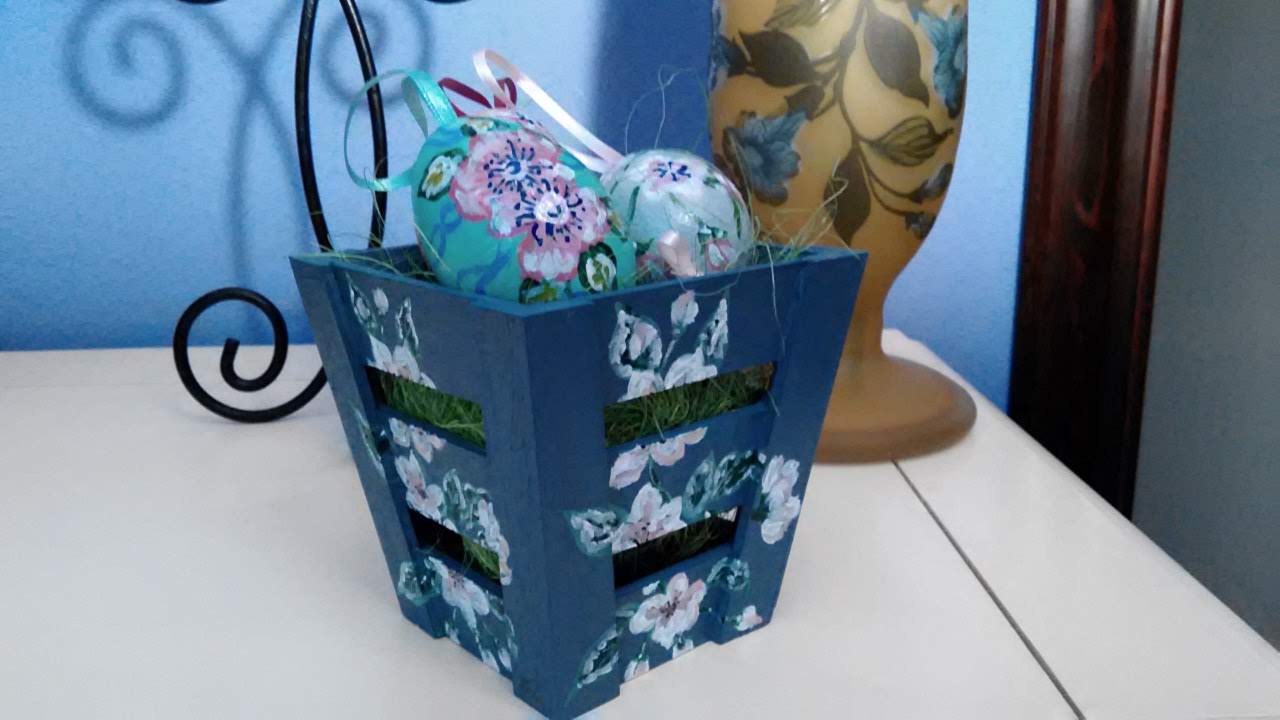 Coșuleț lemn cu 3 ouă pictate în culori acrilice, vernisate.