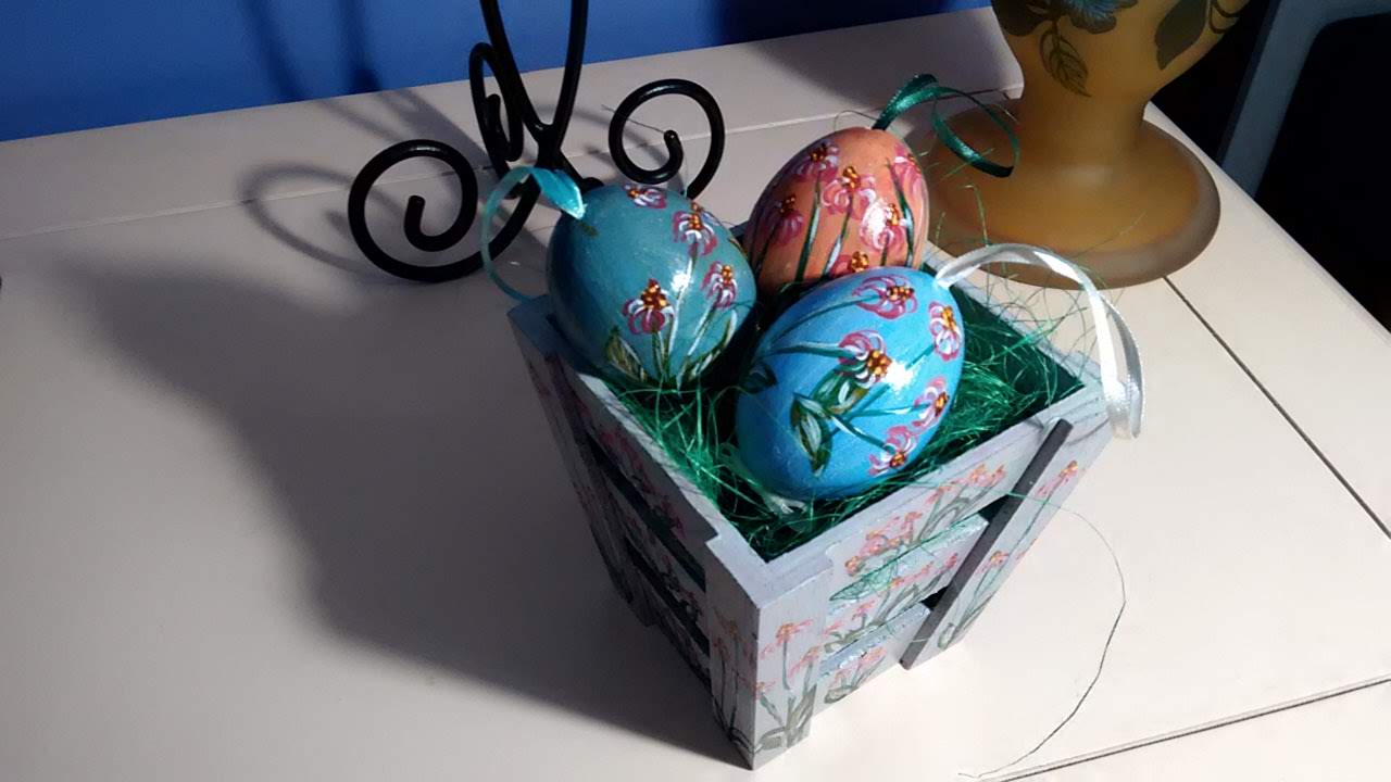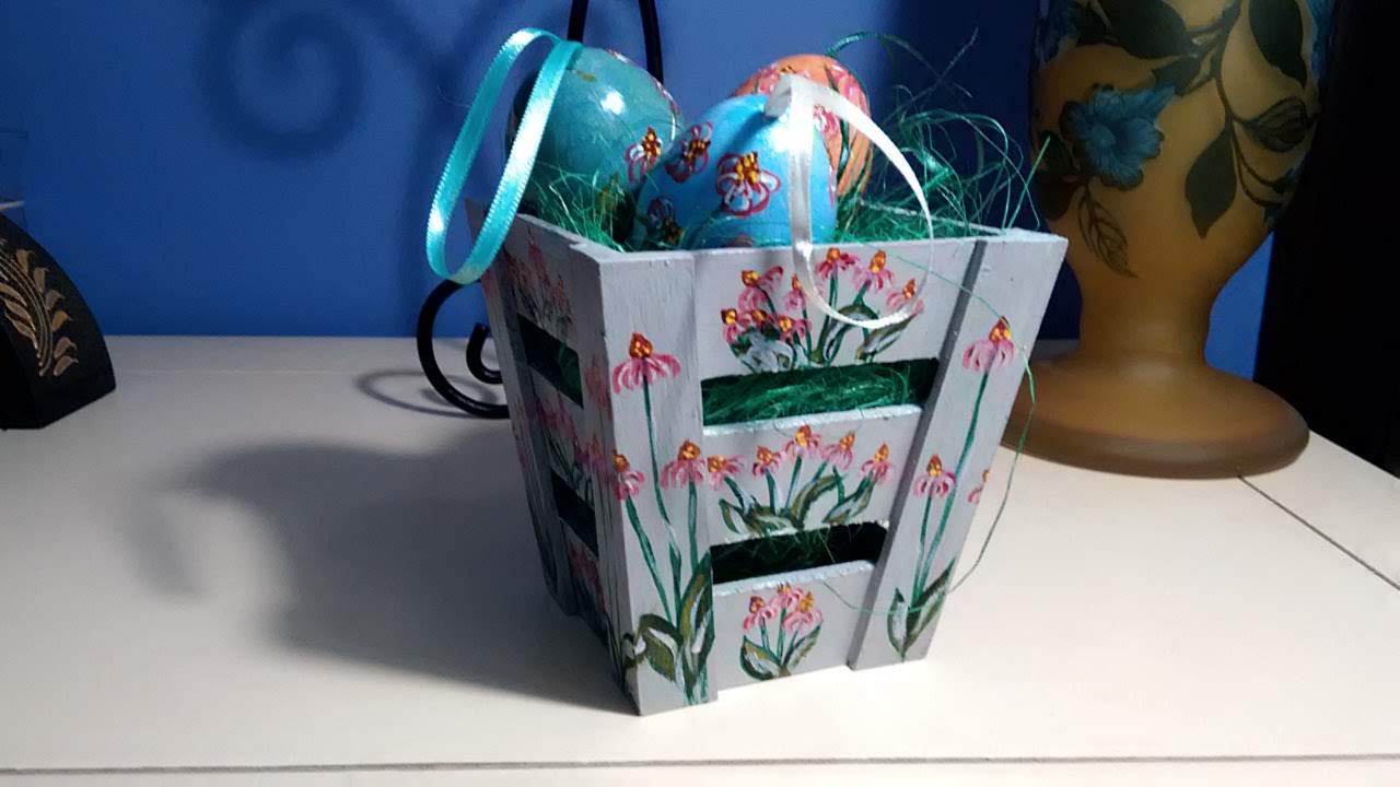 Cadouri pictate PasteCoșuleț lemn cu 3 ouă pictate în culori acrilice, vernisate.