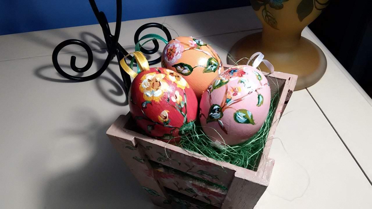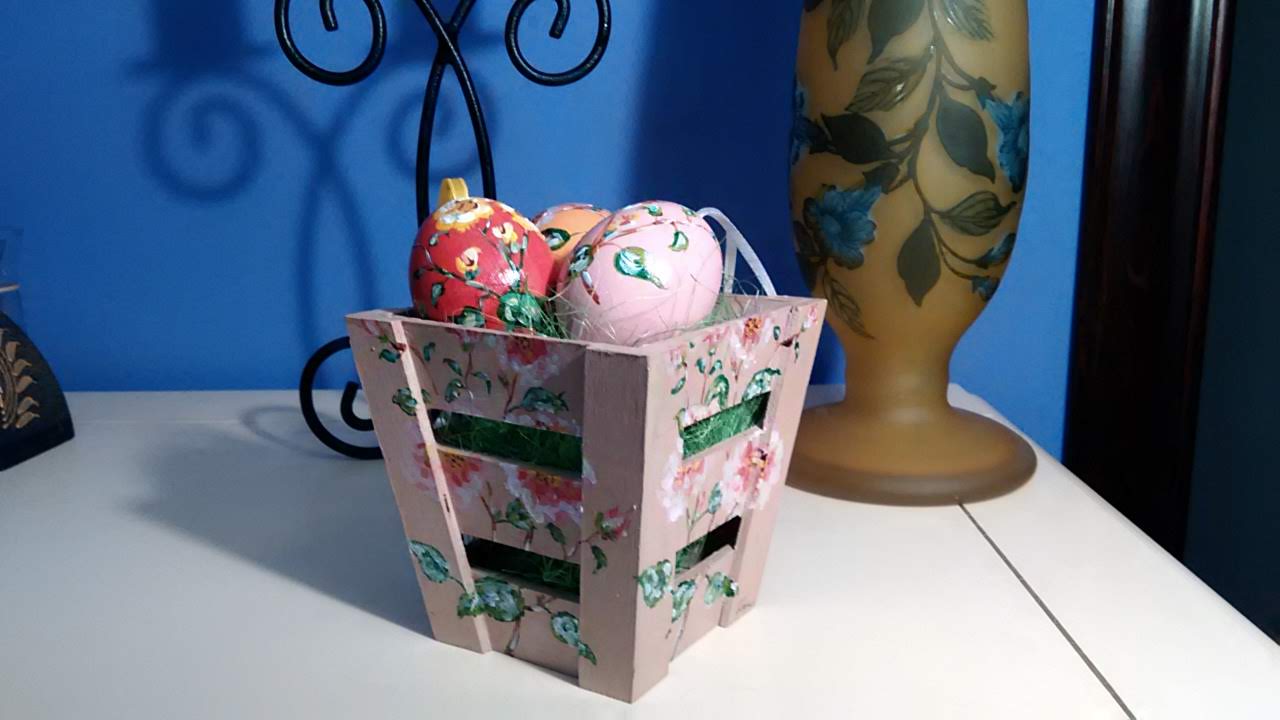 Cadouri pictate PasteCoșuleț lemn cu 3 ouă pictate în culori acrilice, vernisate.