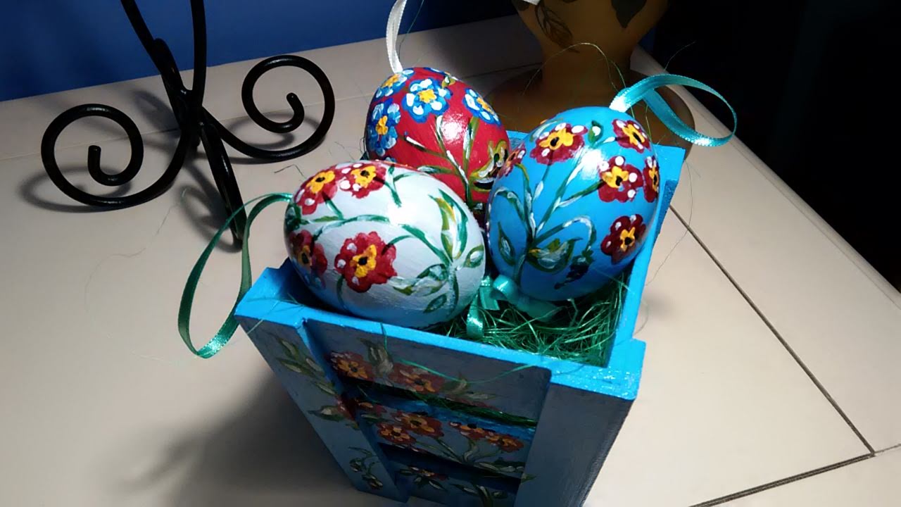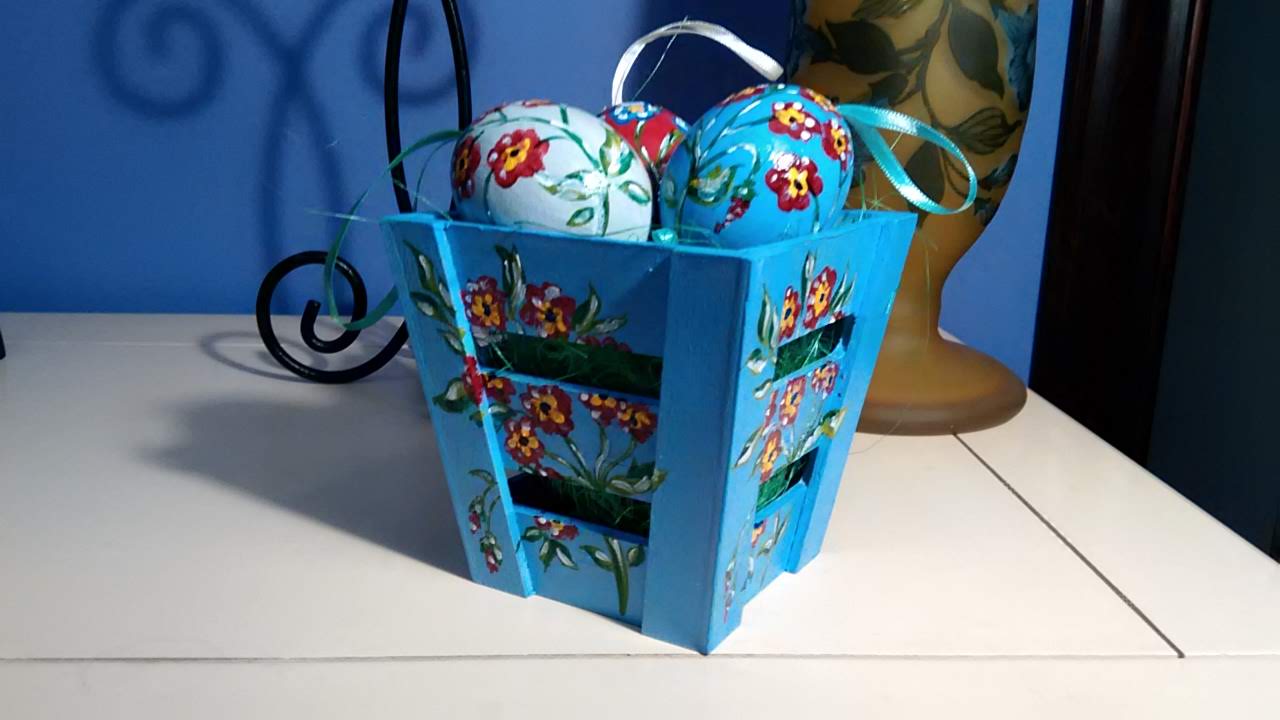 Coșuleț lemn cu 3 ouă pictate în culori acrilice, vernisate.