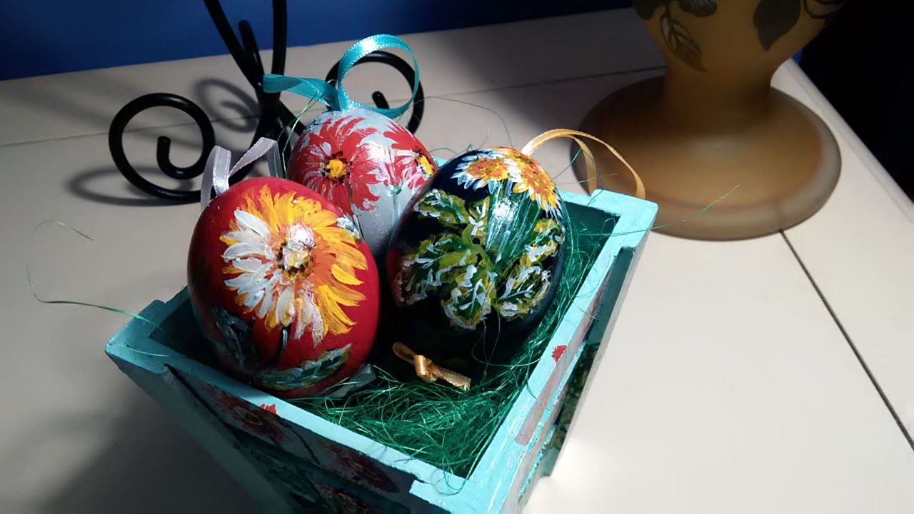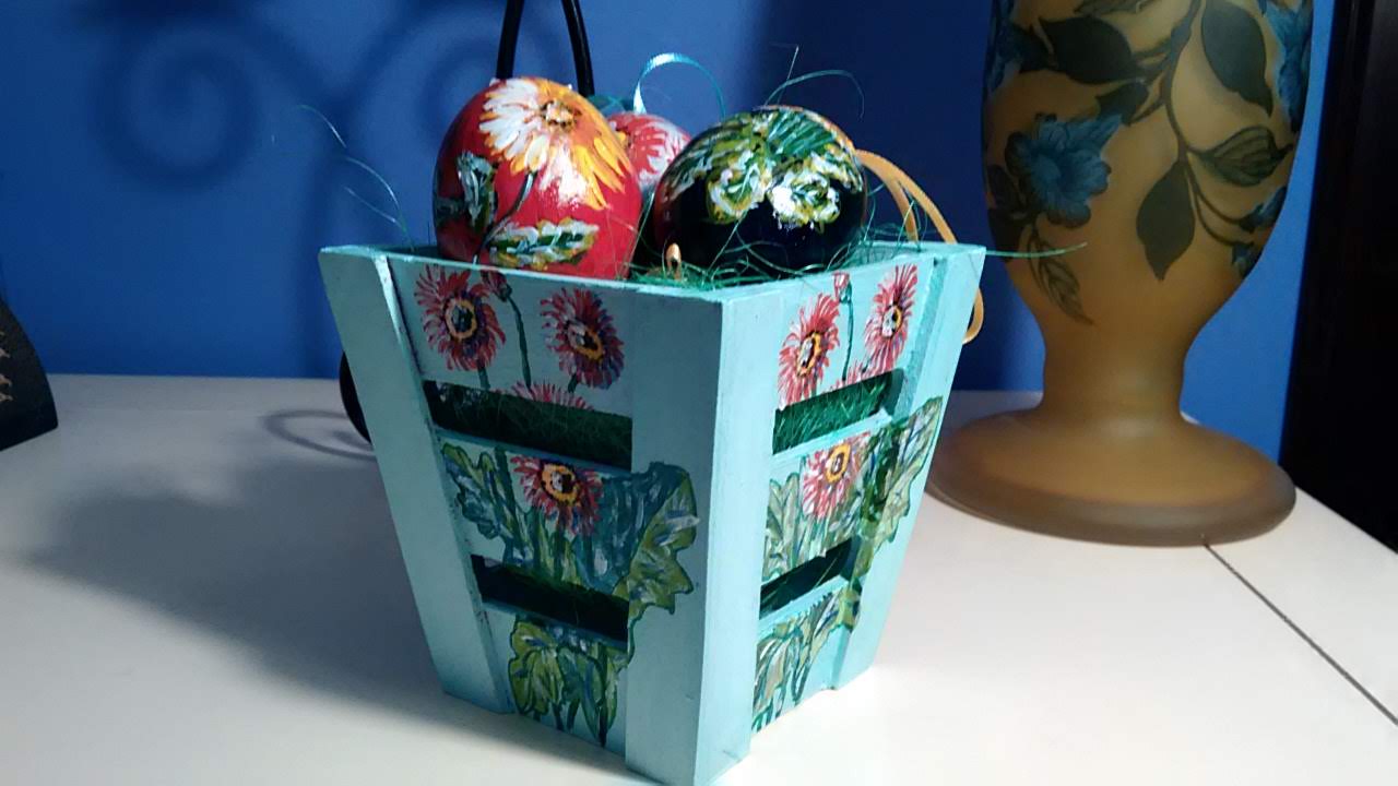 Cadouri pictate PasteCoșuleț lemn cu 3 ouă pictate în culori acrilice, vernisate.