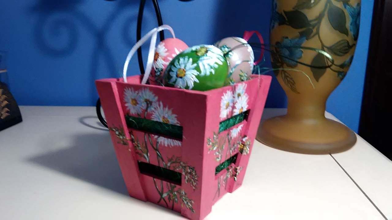 Coșuleț lemn cu 3 ouă pictate în culori acrilice, vernisate.