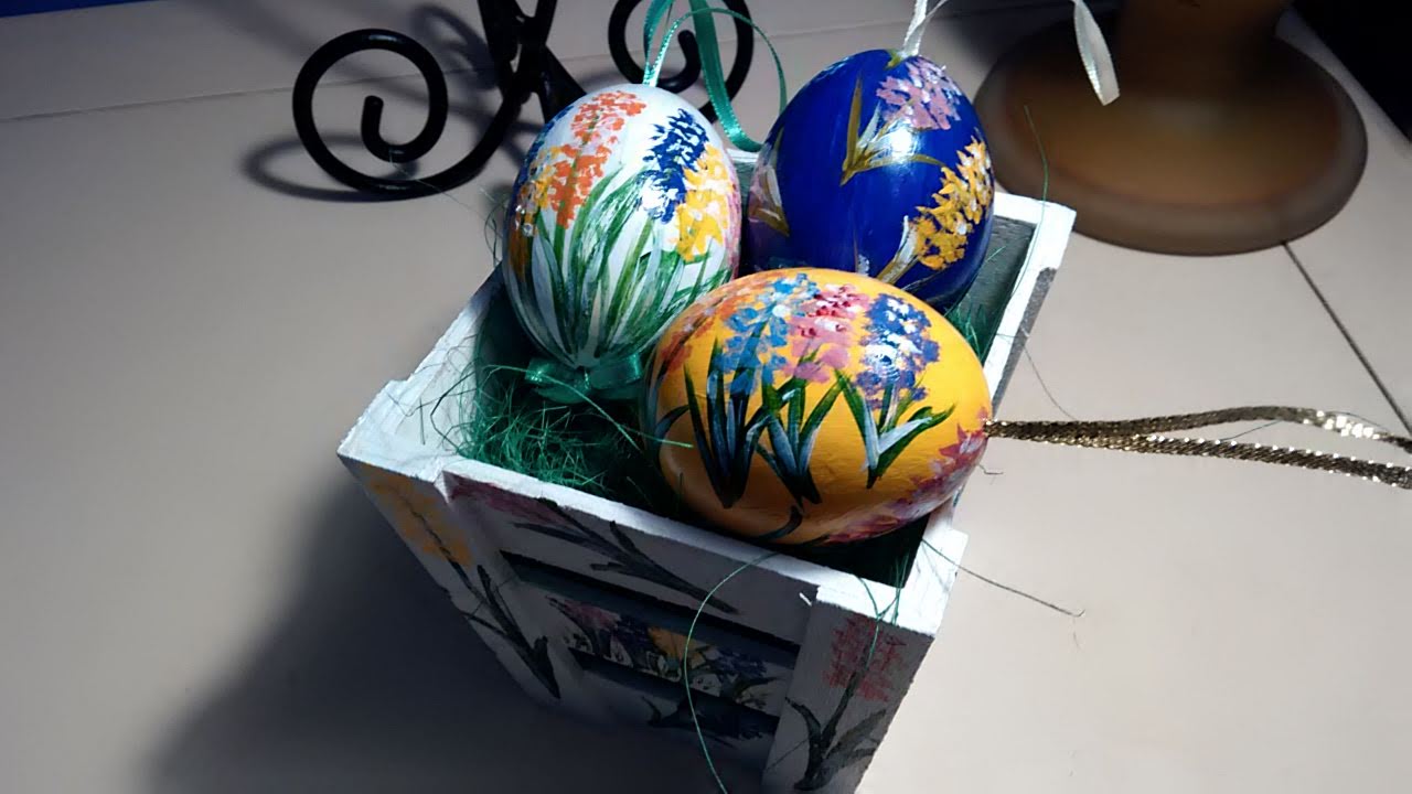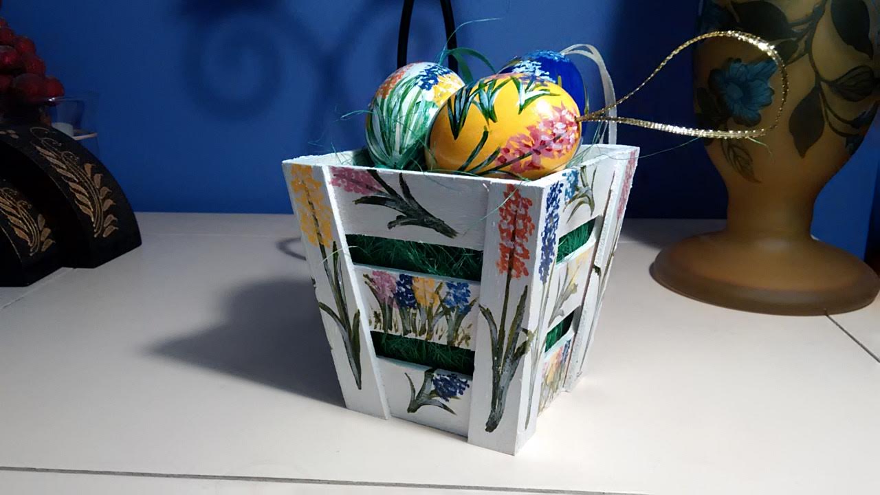 Coșuleț lemn cu 3 ouă pictate – ZAMBILE COLORATE