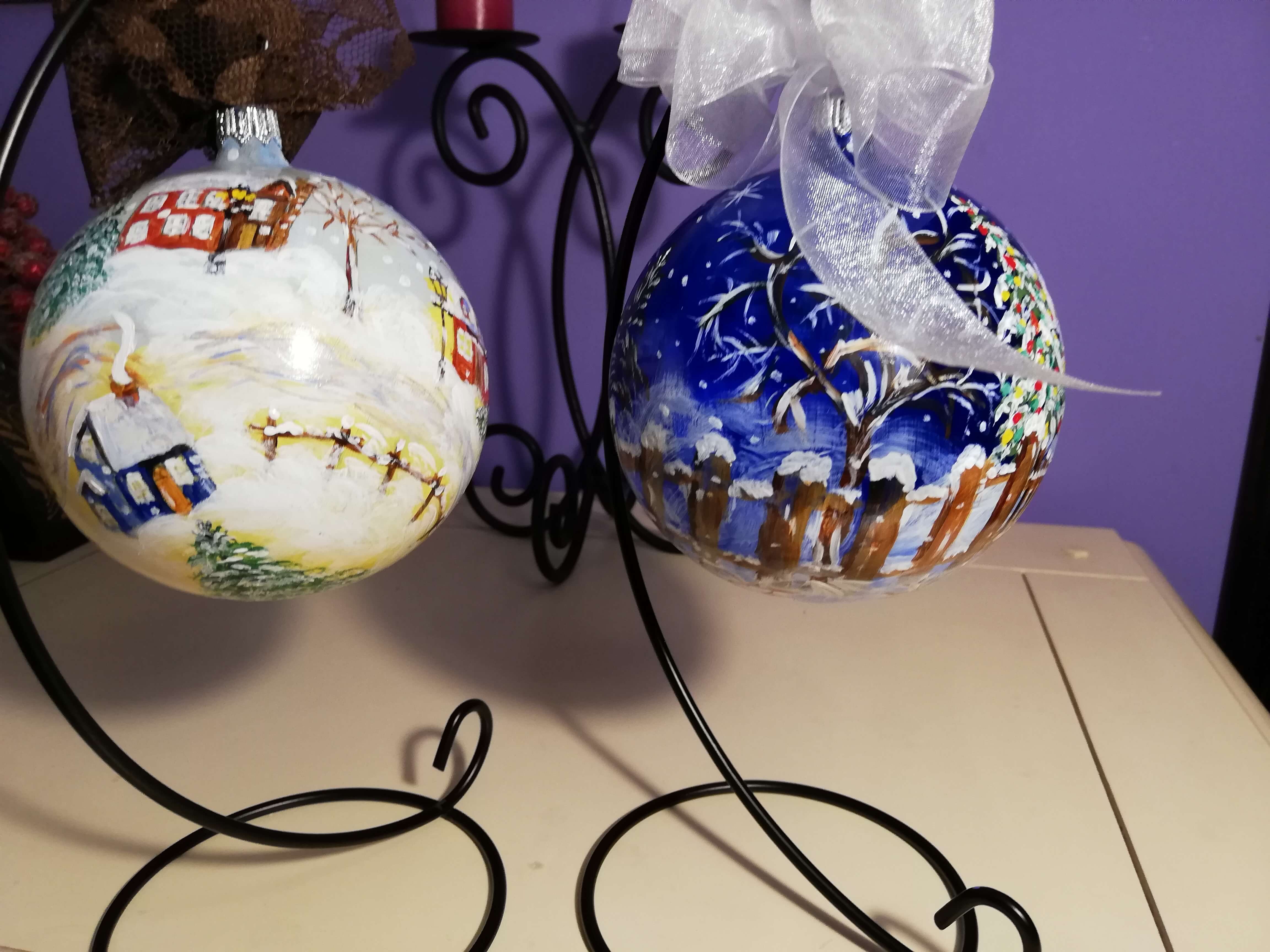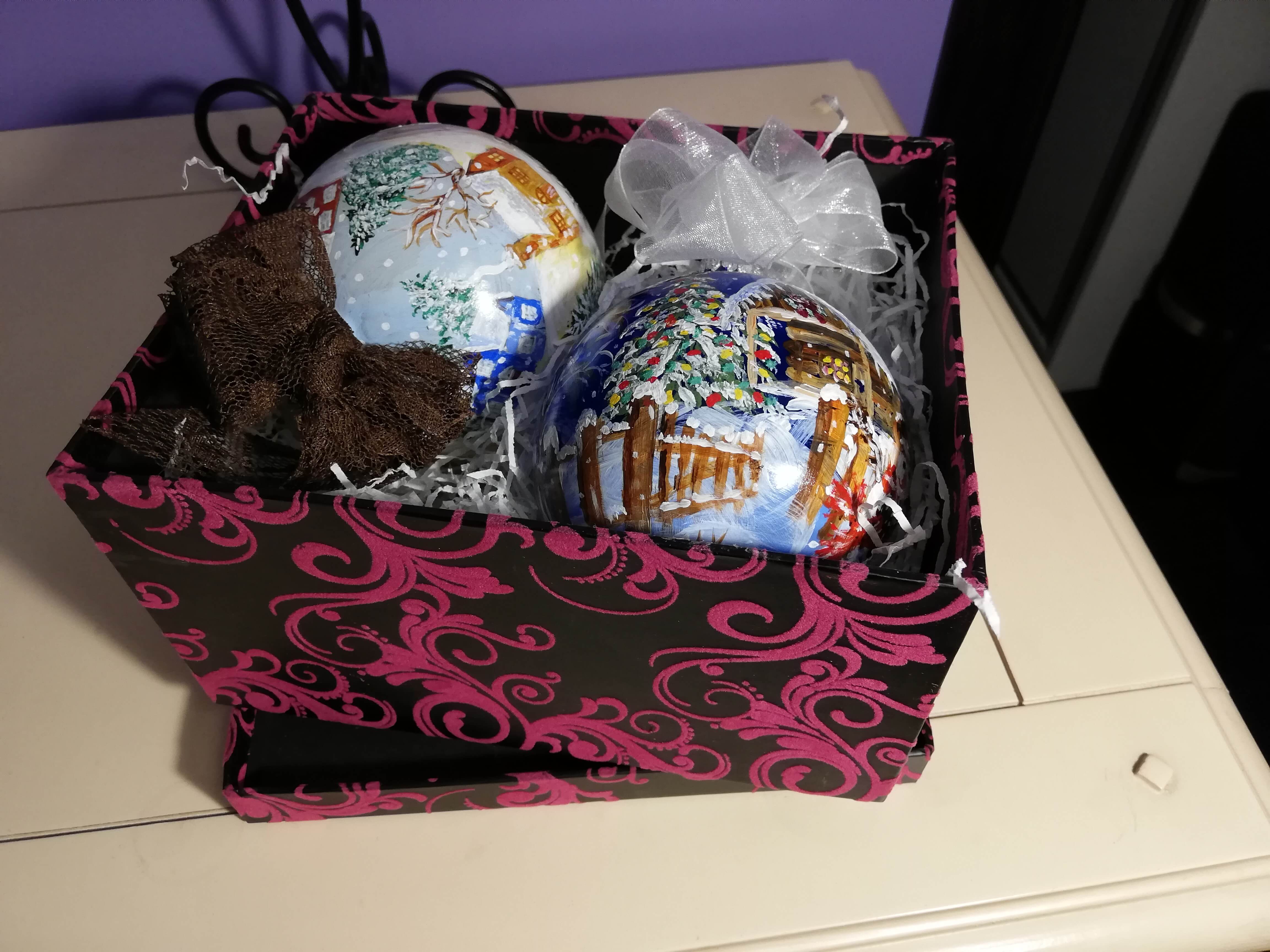 Cadouri pictate pentru CraciunCutie cu 2 globuri sticlă pictate în culori acrilice, vernisate.