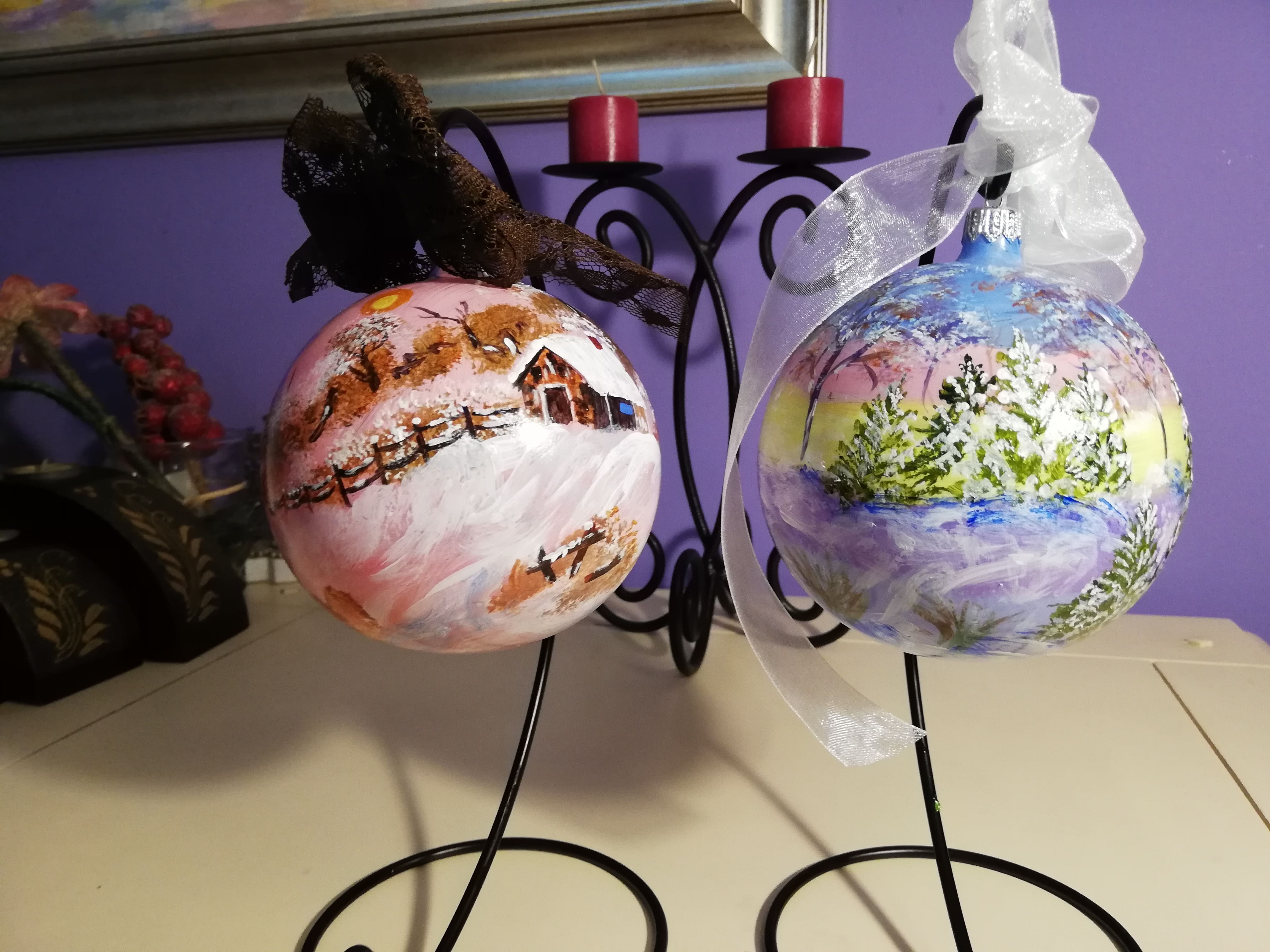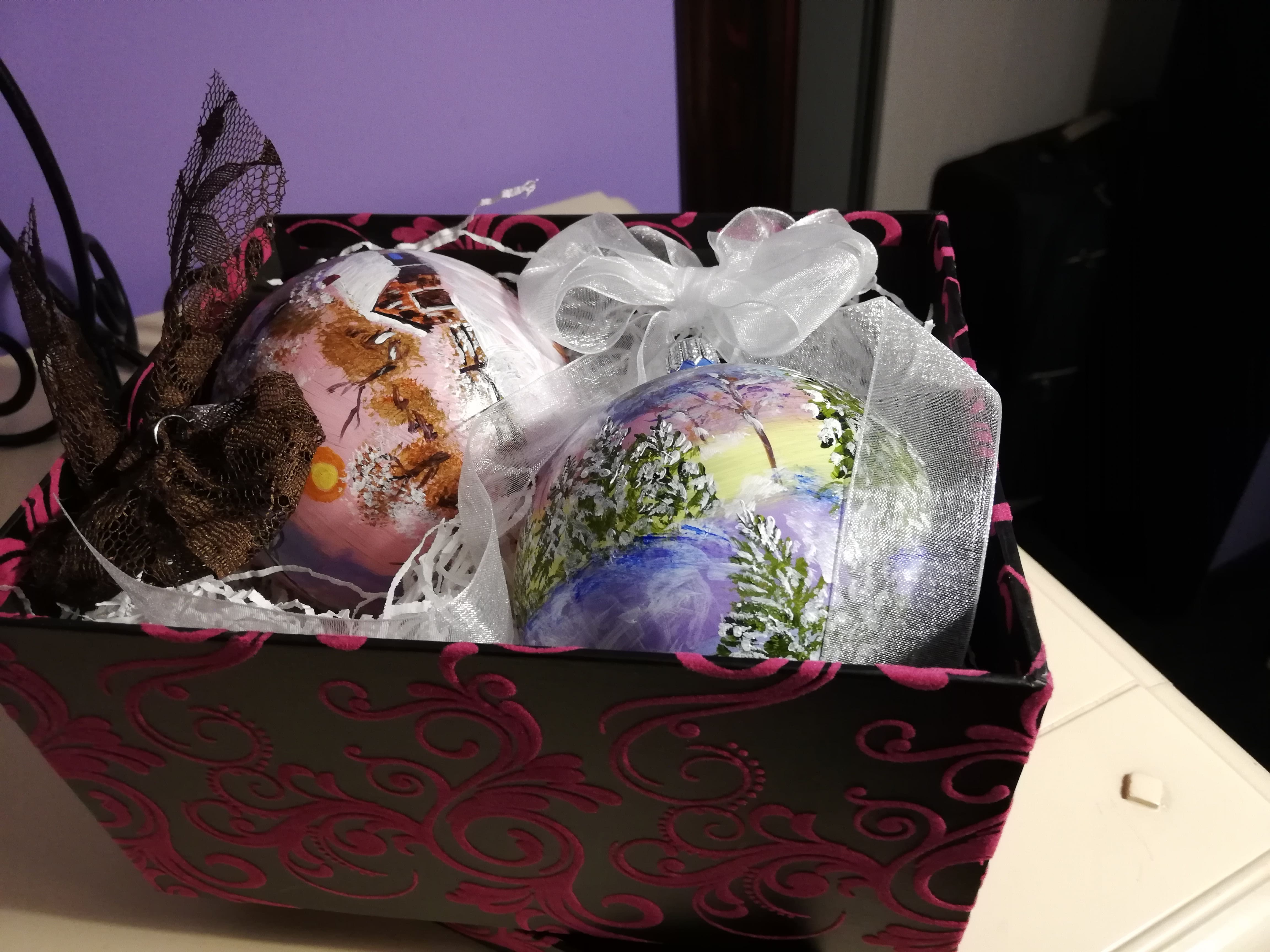 Cadouri pictate pentru CraciunCutie cu 2 globuri sticlă pictate în culori acrilice, vernisate.
