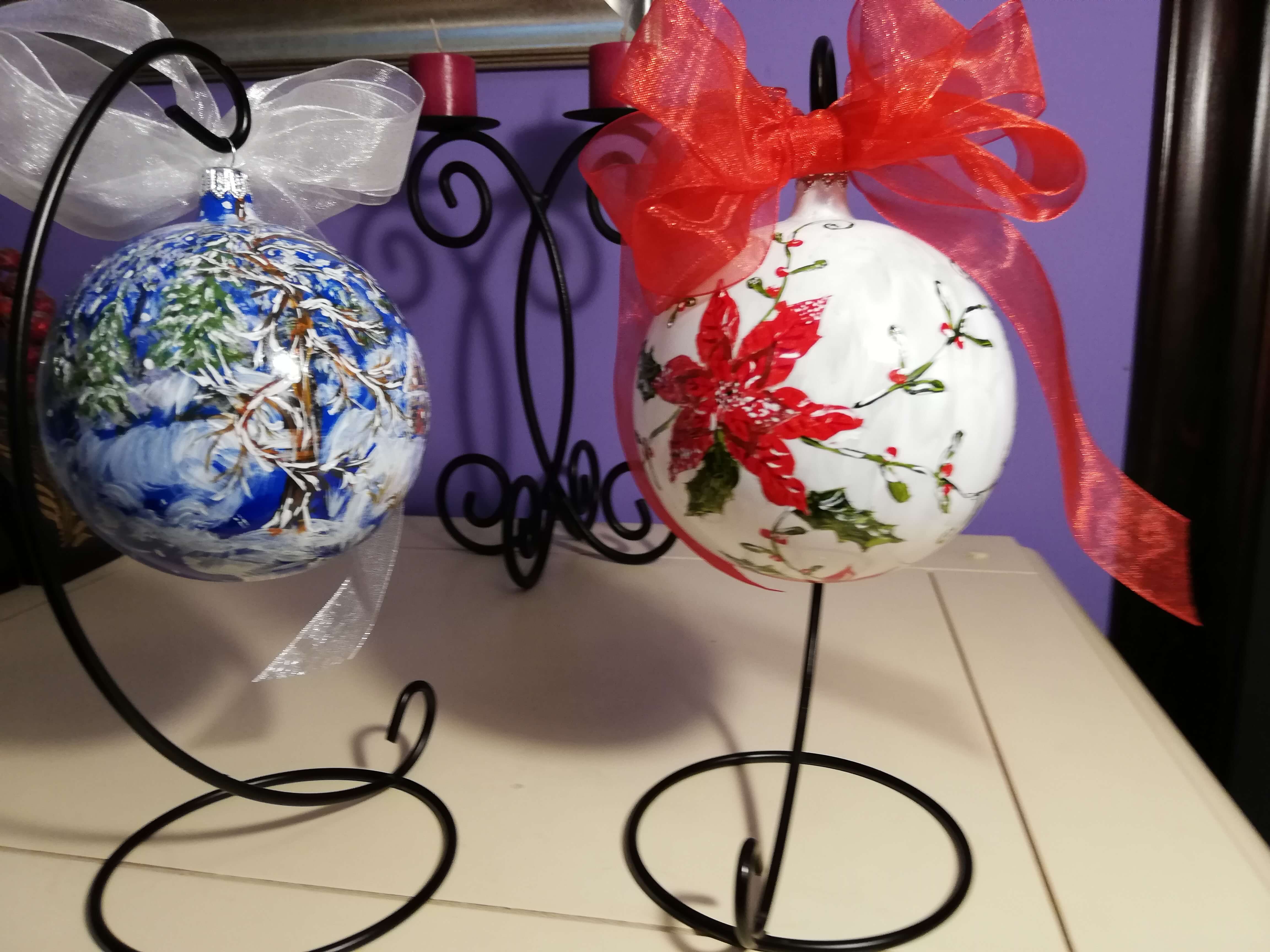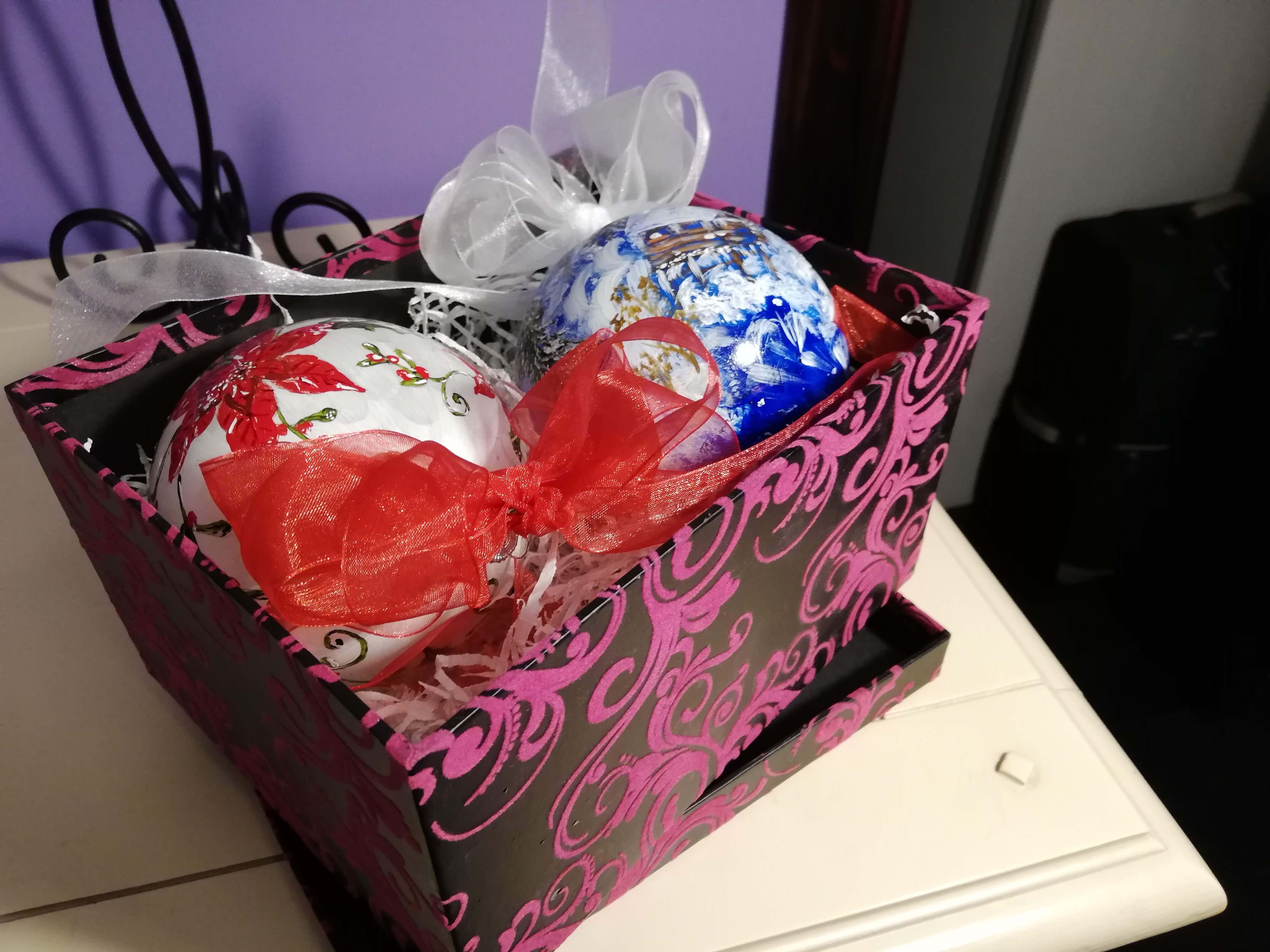Cadouri pictate pentru CraciunCutie cu 2 globuri sticlă pictate în culori acrilice, vernisate.