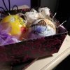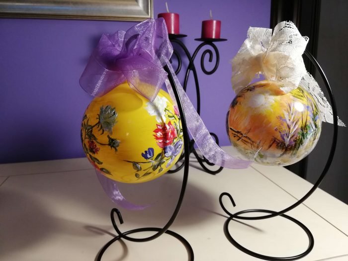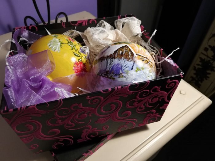 Cutie cu 2 globuri sticlă pictate în culori acrilice, vernisate.