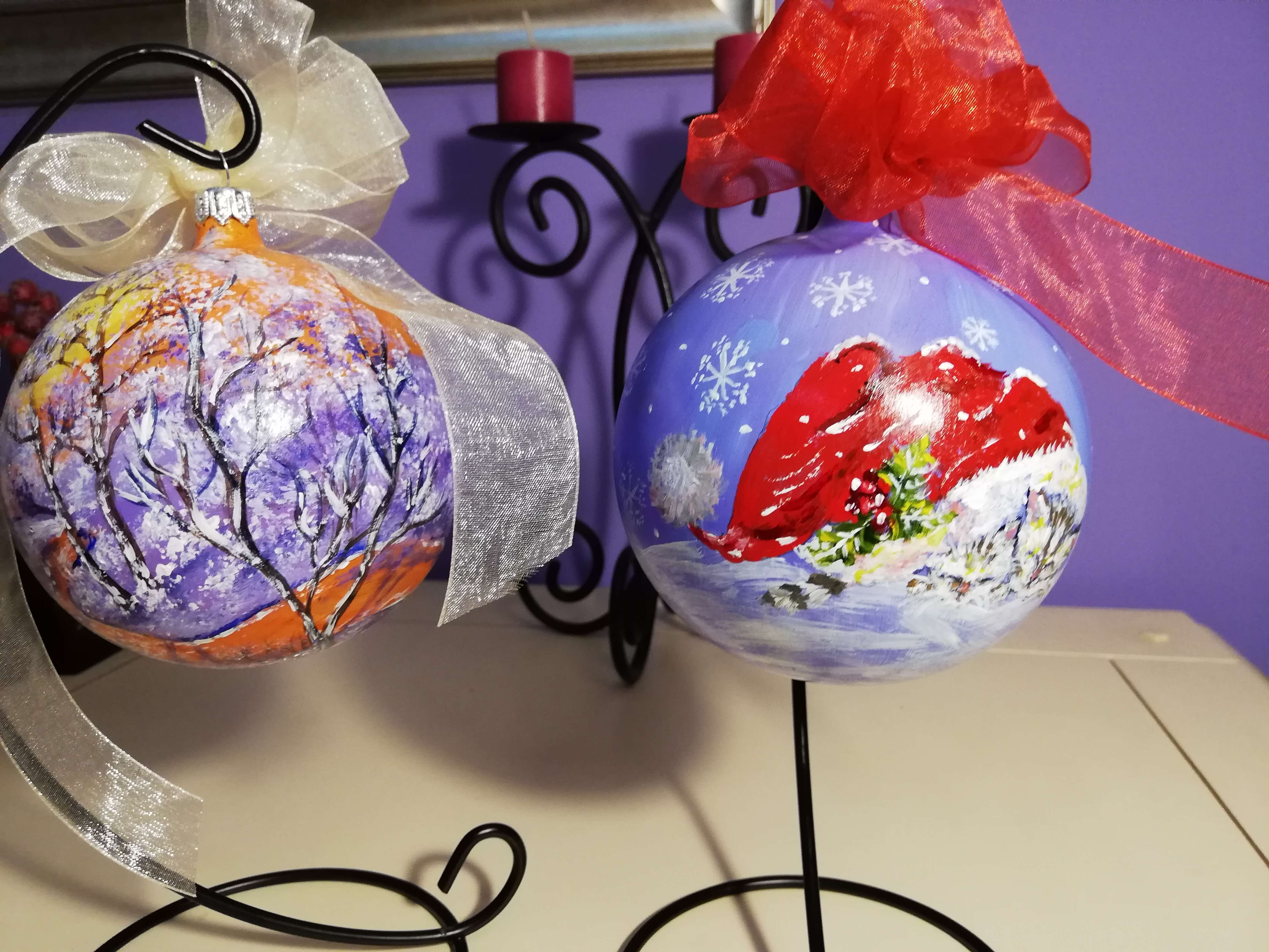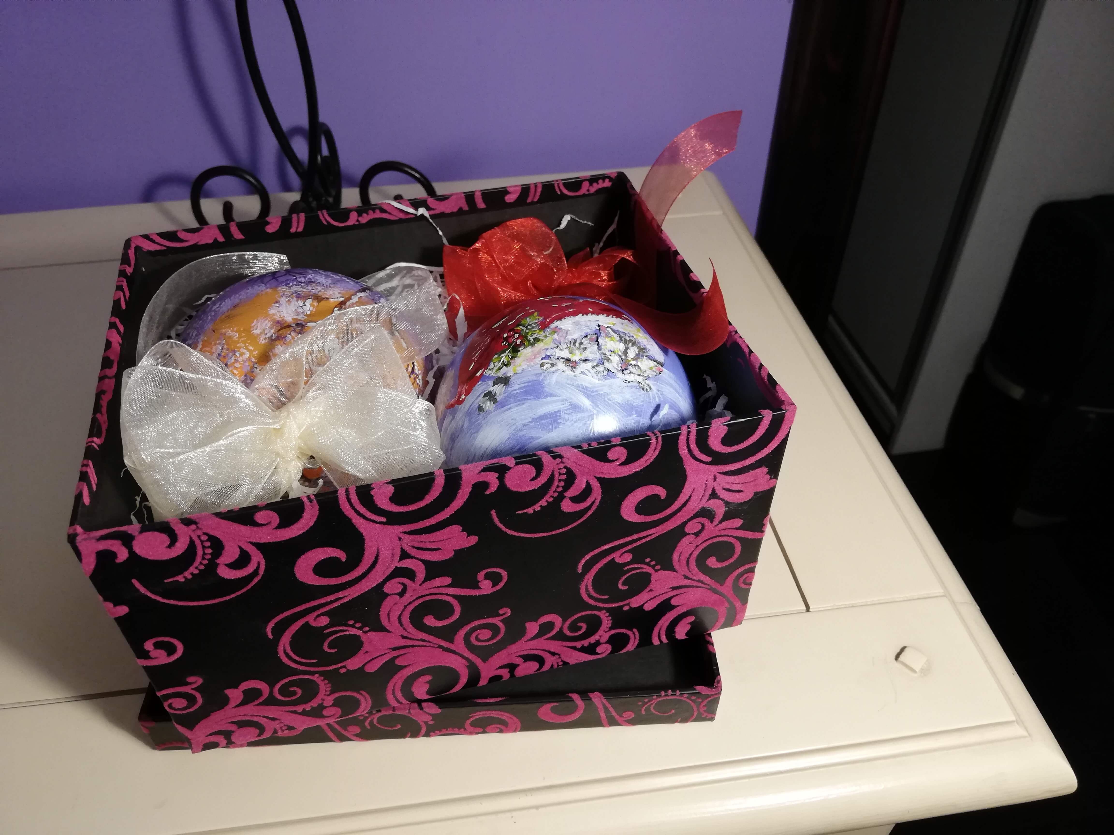 Cadouri pictate pentru CraciunCutie cu 2 globuri sticlă pictate în culori acrilice, vernisate.