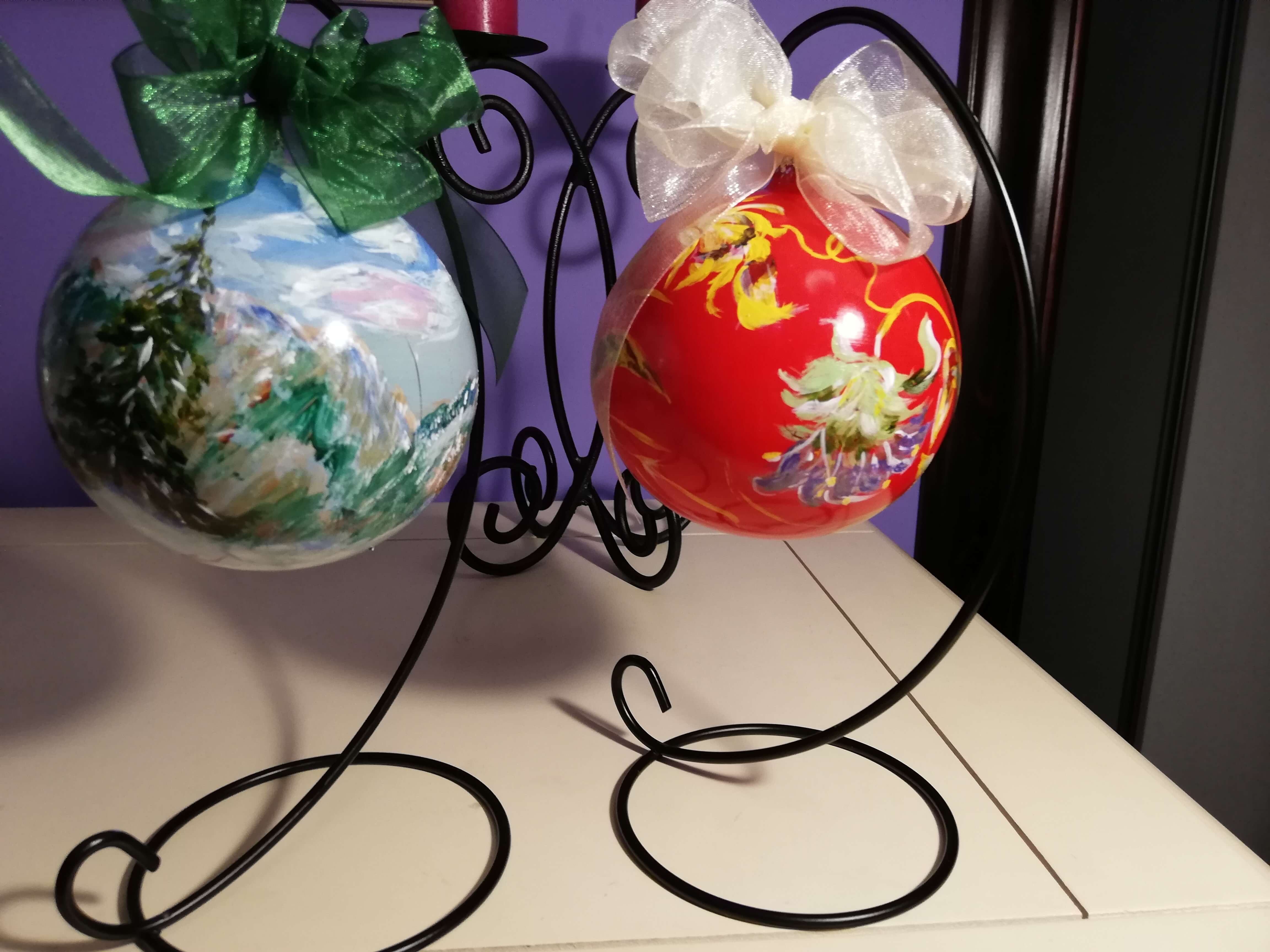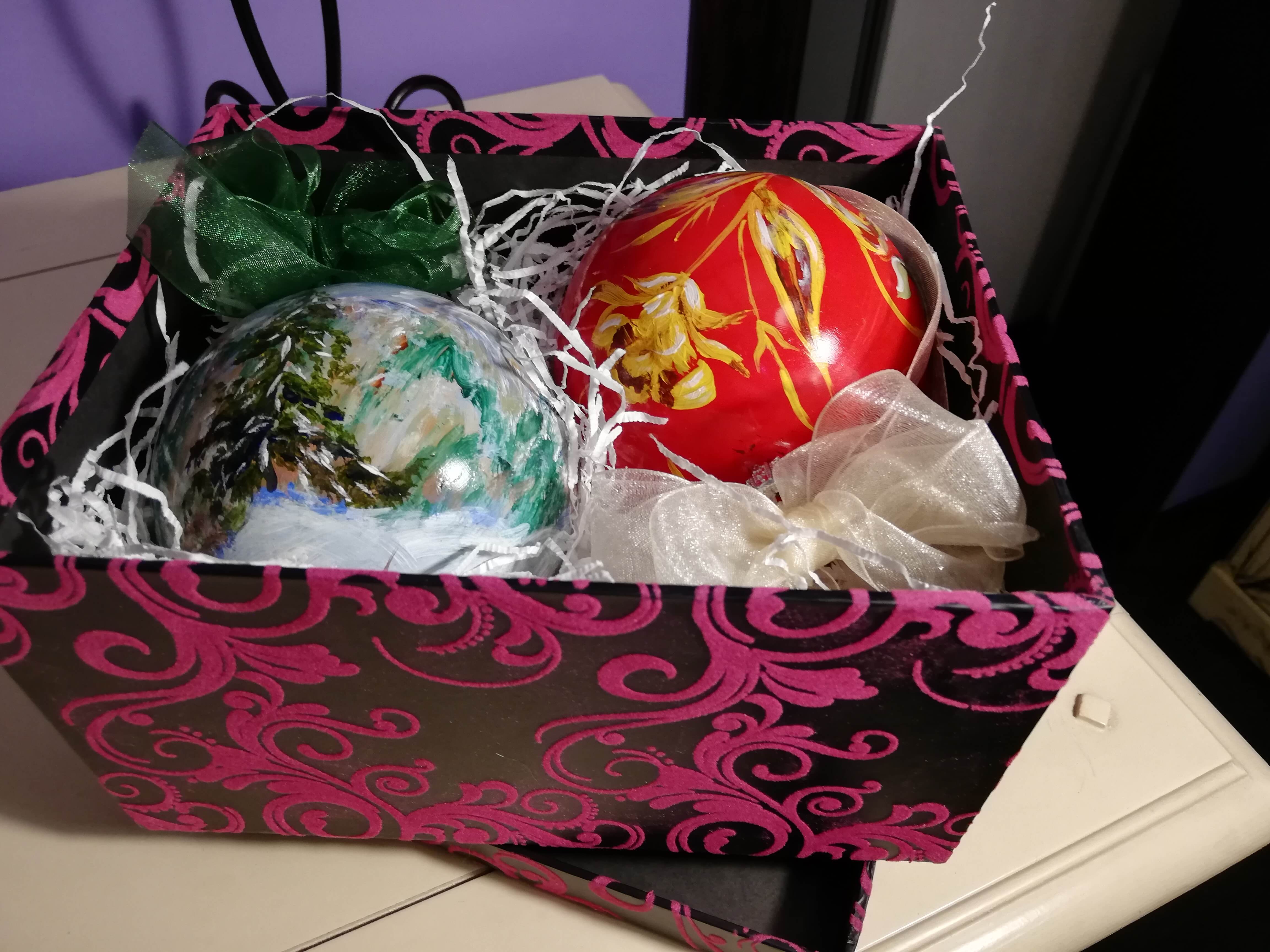 Cutie cu 2 globuri sticlă pictate în culori acrilice, vernisate.