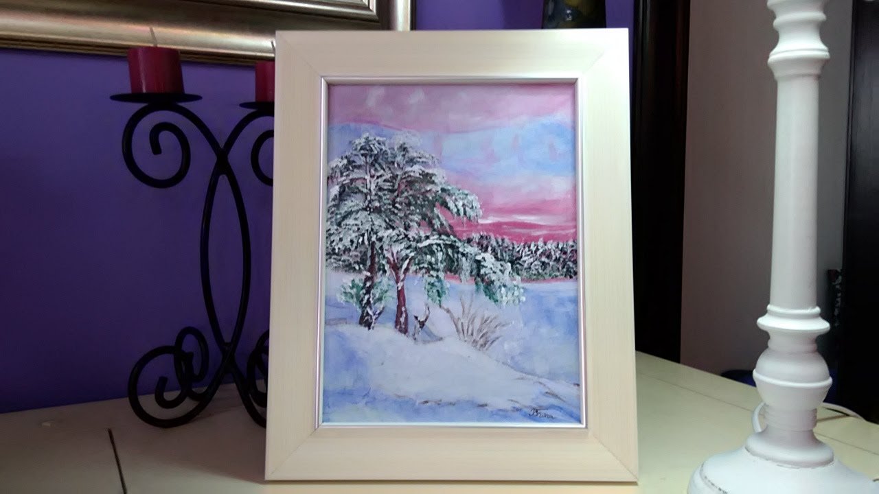 PEISAJ DE IARNĂ – cadou pictat pt. Crăciun – APUS DE SOARE IARNA