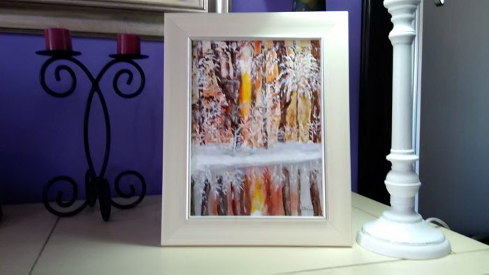 Pictură pe carton pânzat, 18x24cm, în culori acrilice, tehnică în straturi, vernisată și înrămată.  Pădurea ninsă în apus de soare și oglindită în lac….