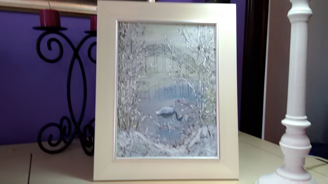 Cadouri pictate pentru CraciunPictură pe carton pânzat, 18×24, în culori acrilice, tehnică în straturi, vernisată și înrămată. Lebăda grațioasă pe lacul înghețat la începutul zilei….