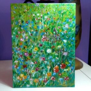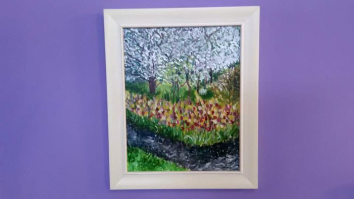 Cadou pictat pe carton pânzat – ,,LIVADĂ CU POMI ÎNFLORIȚI ȘI LALELE”
