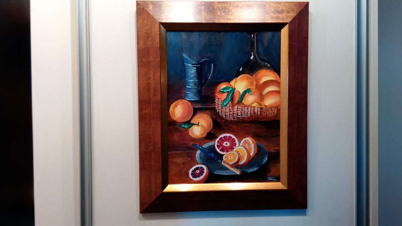 Cadou pictat pe carton pânzat – ,,NATURĂ STATICĂ CU PORTOCALE”